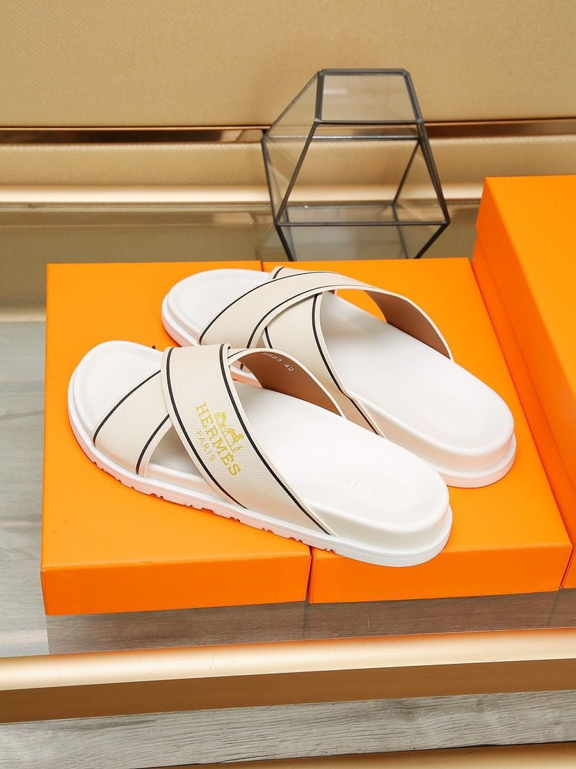HM Men's Cross Strap Slide Beige Cowhide 544097