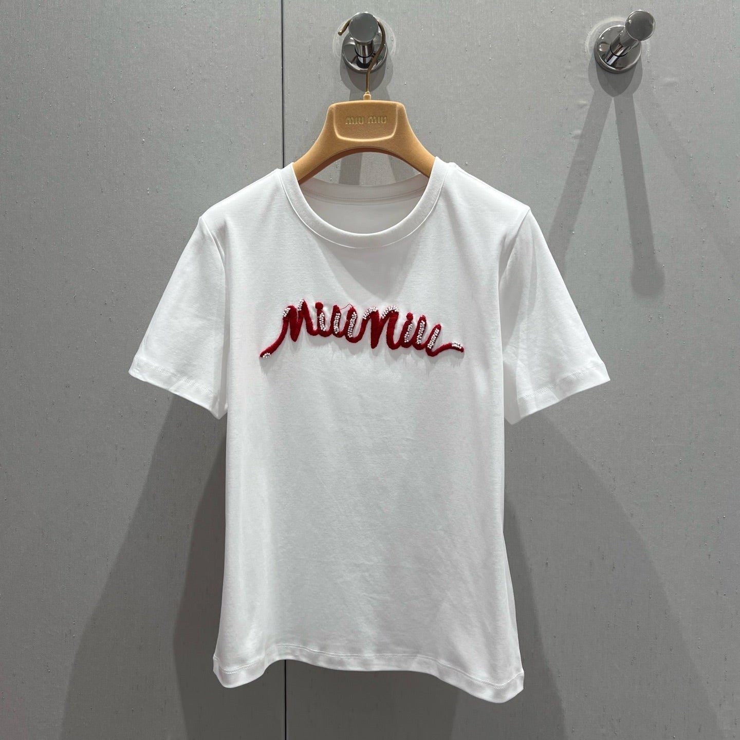 Miu Miu 25 Beaded Short Sleeve T-shirt White Red Cotton 210556