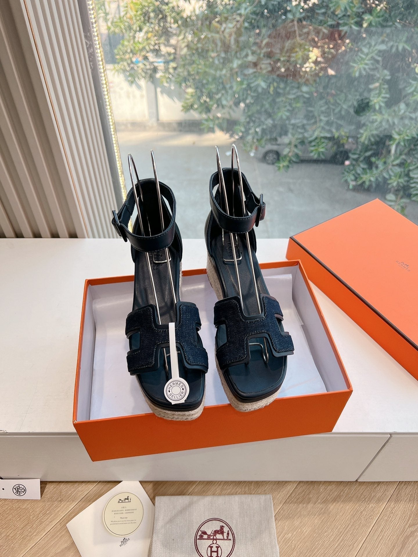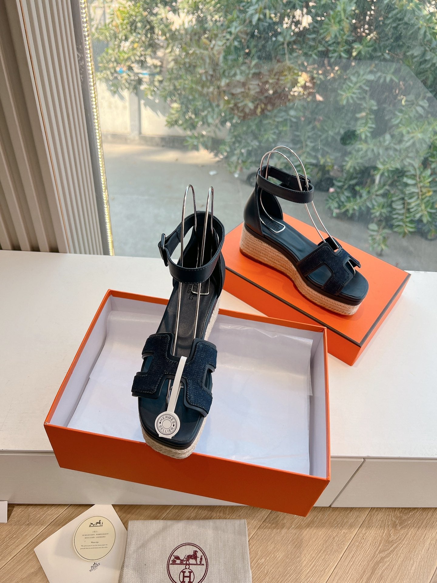 - Material: Denim and Goatskin, wedged rope heel