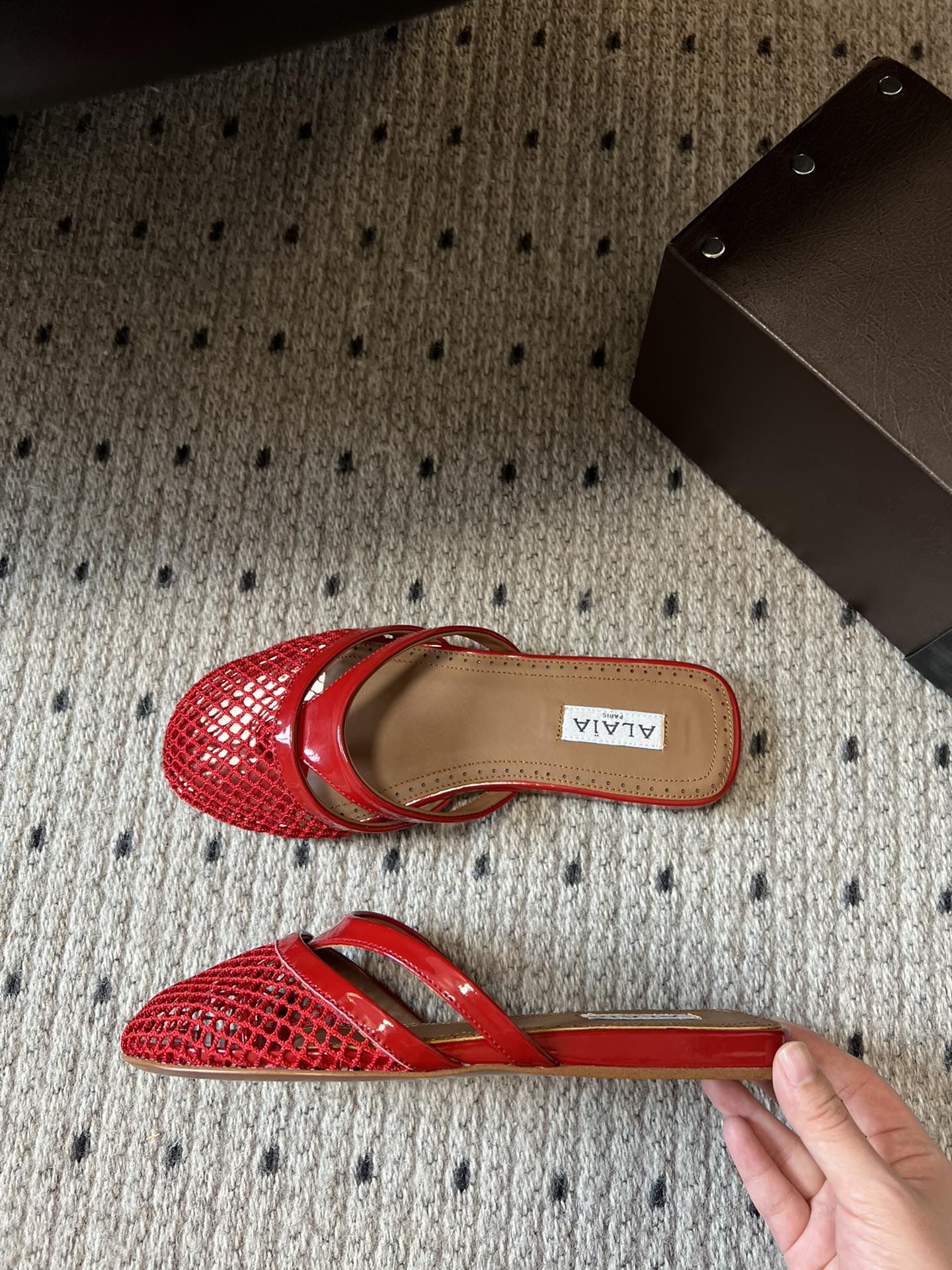 Alaia 25 Infradito Fishnet Flat Mules Red Lampskin 303710