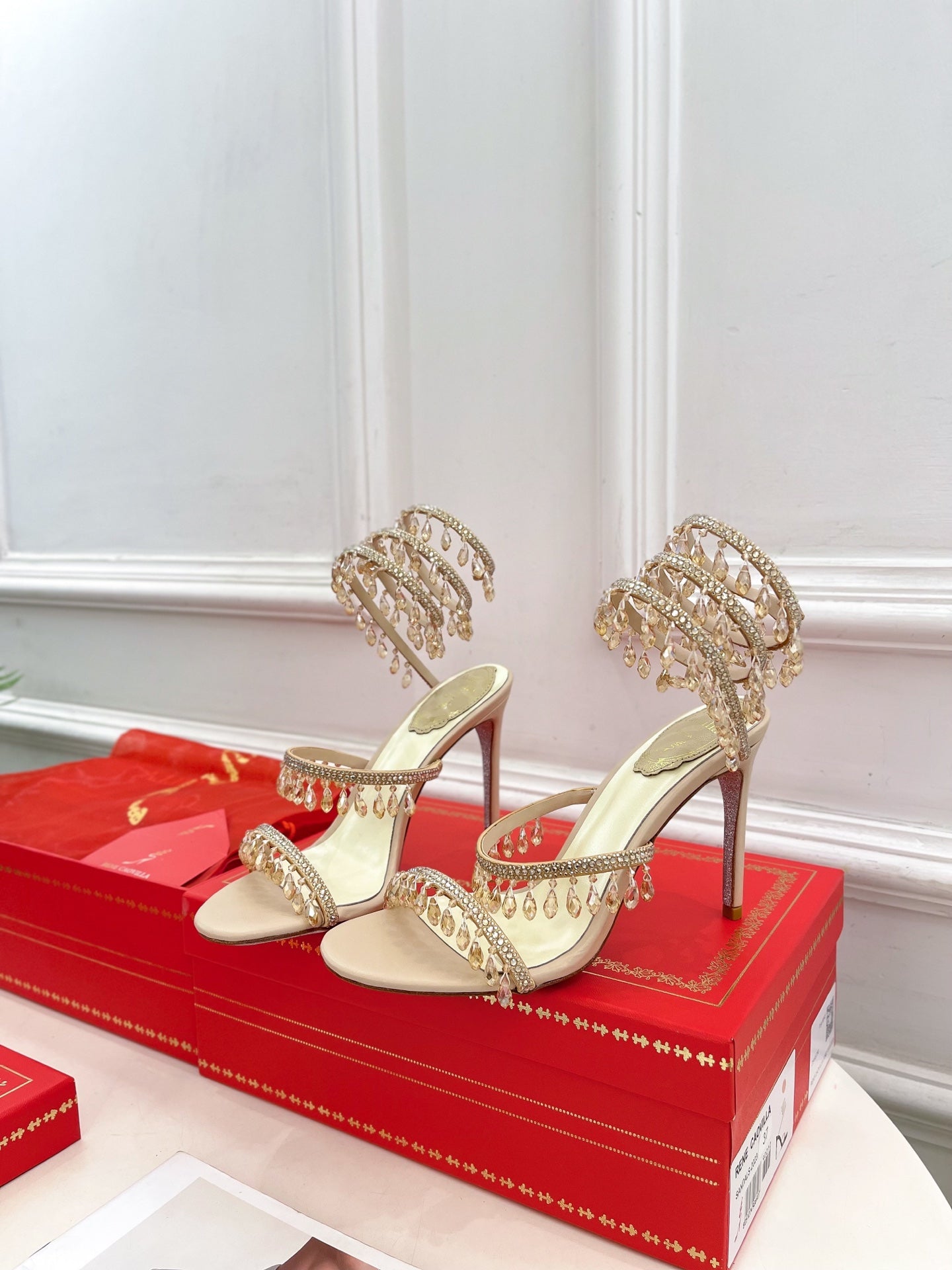 RC 25 Crystal Tassel High-Heeled Sandals Pink Nude Silk Crystal Diamond 251008