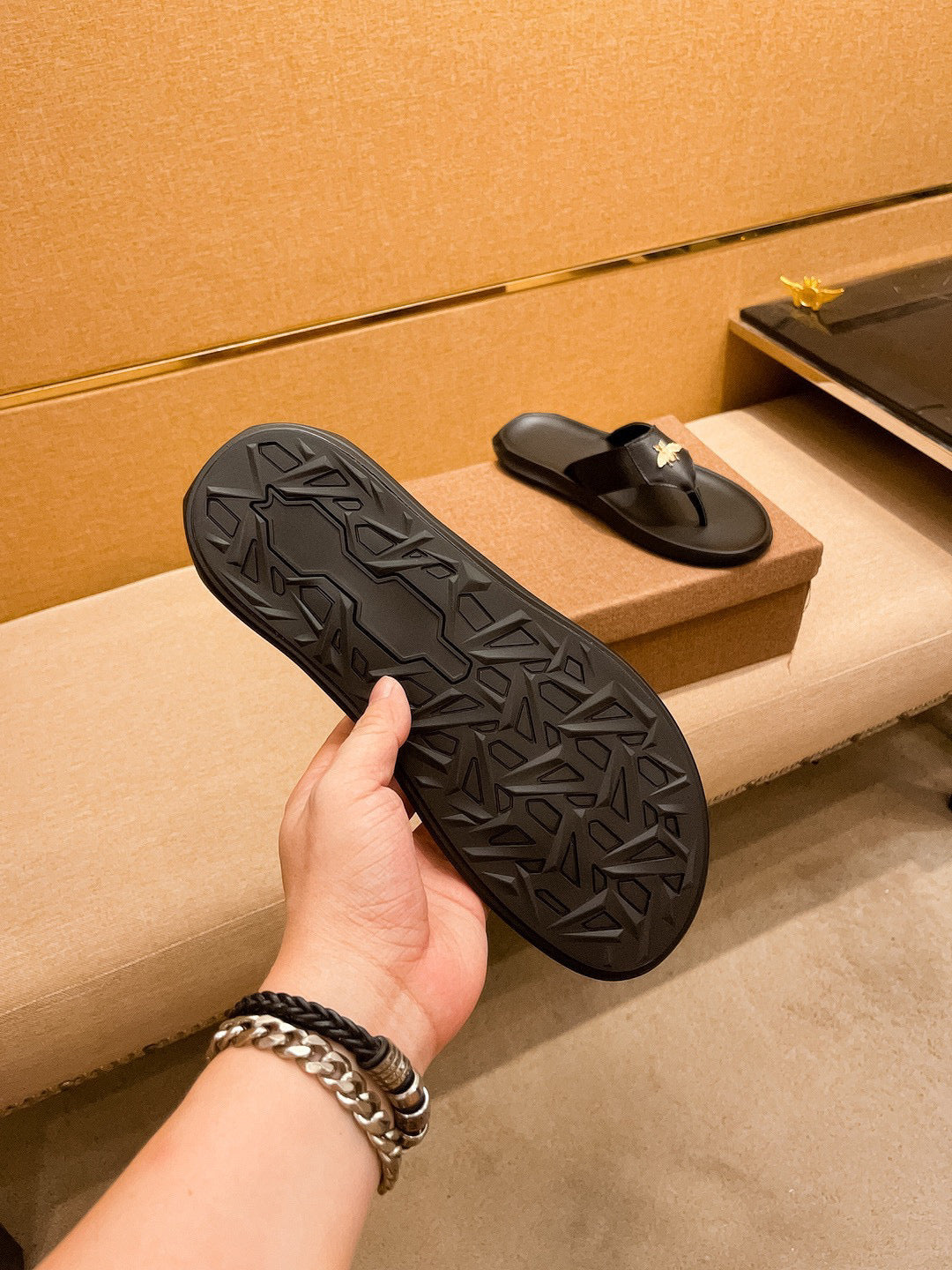 GG Men's Bee Sandals Slide Black Leather 587238