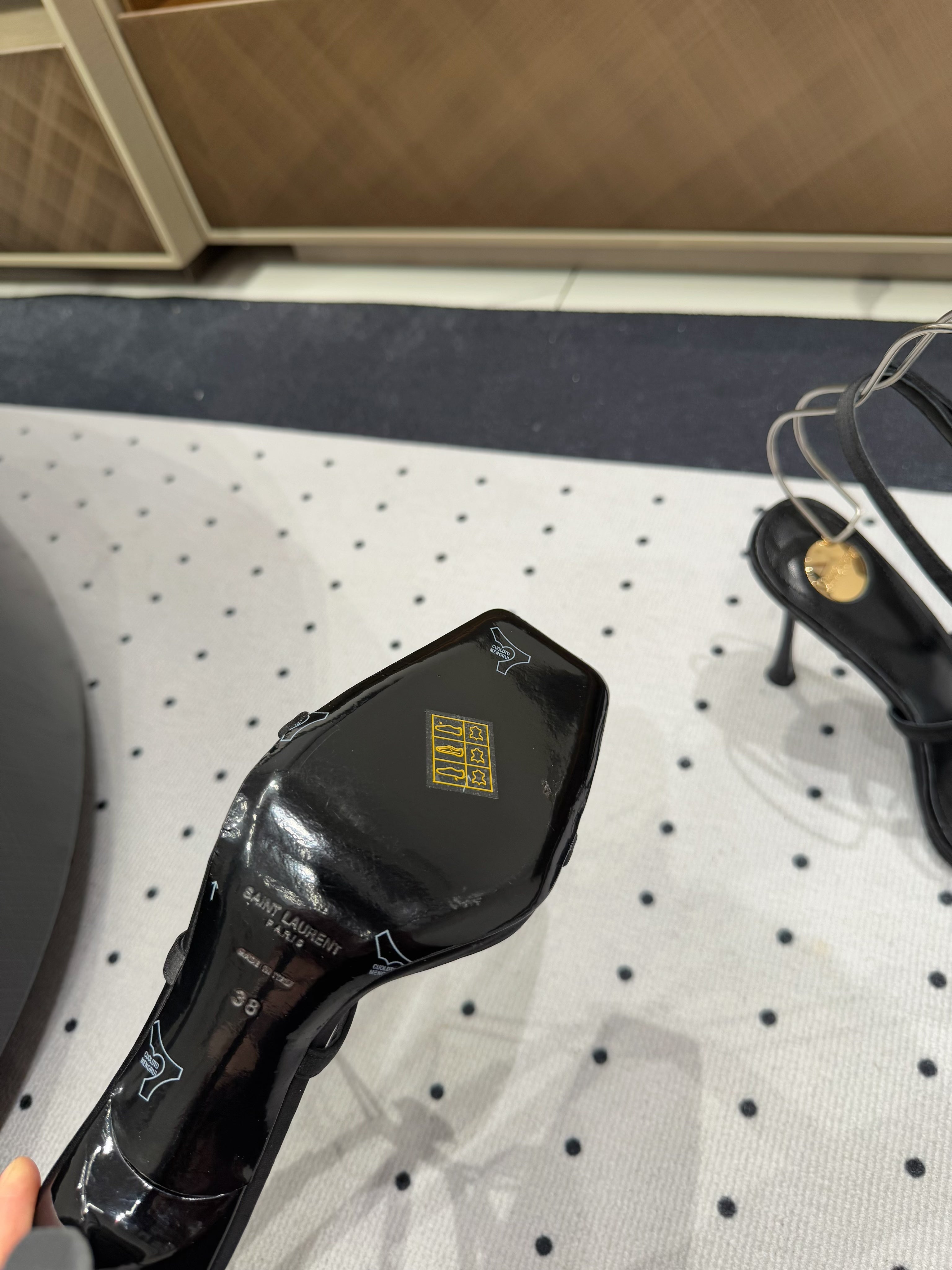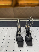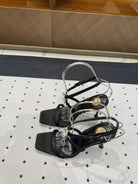 HIGH HEEL SANDALS IN BLACK SILK WTH STRAPS ATTACHED GEM