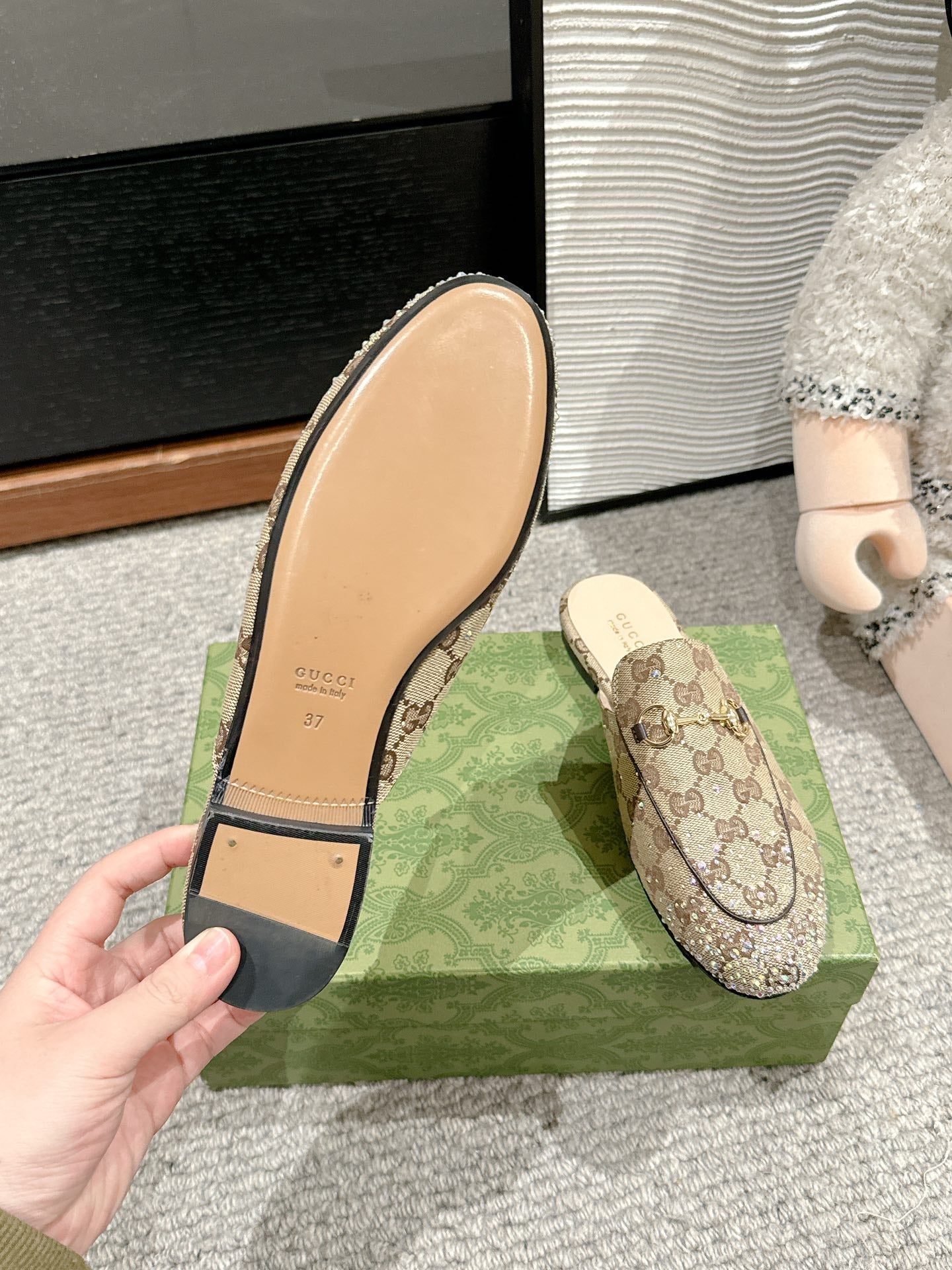Horsebit Mule Beige Ebony Canvas Crystal-Embellished