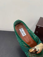 ALAIA BALLET FLATS IN COOL GREEN MESH FISHNET WITH GOLD HARDWARE