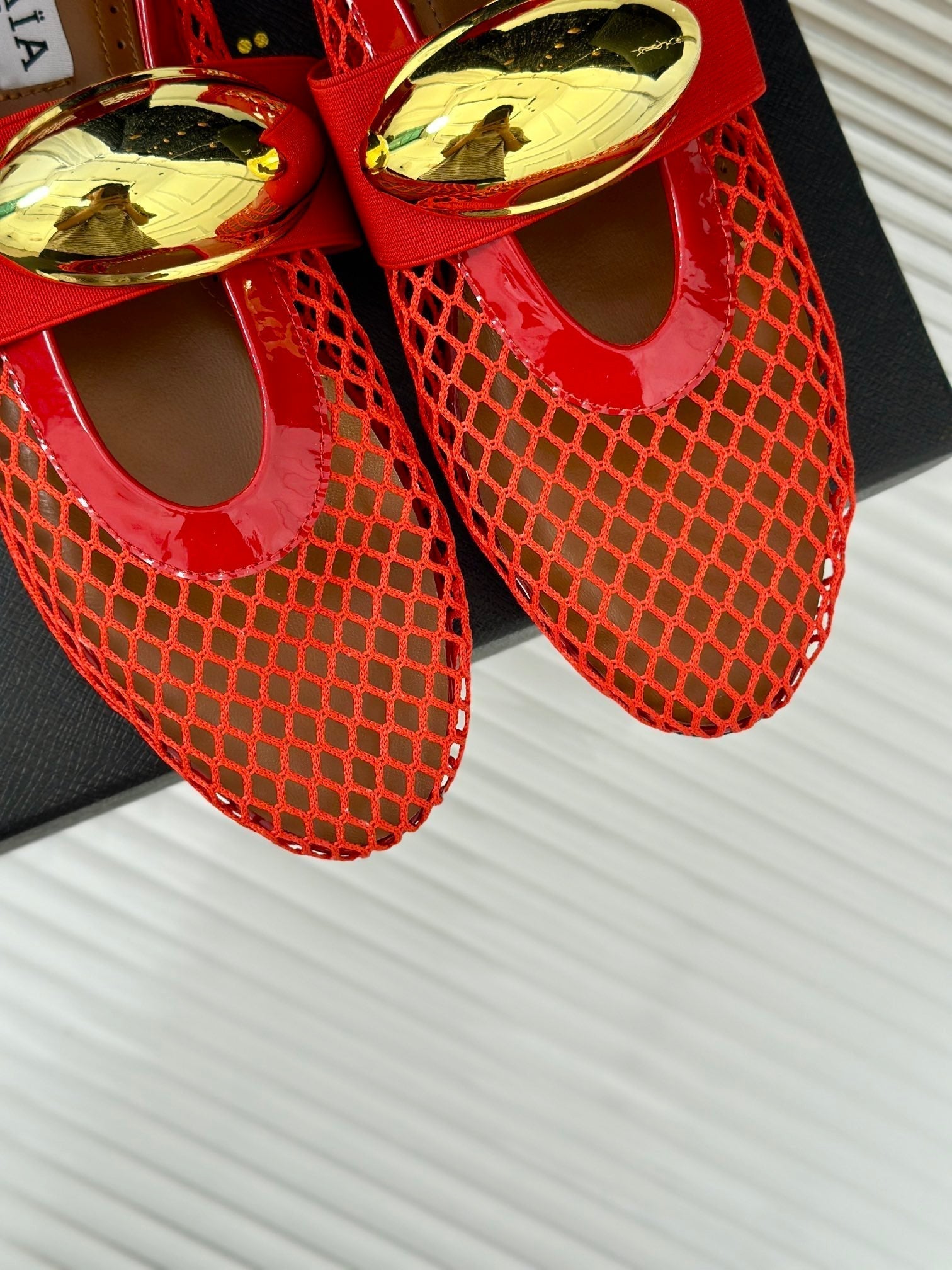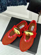 ALAIA MARY JANE SHOES IN CHERRY RED MESH WITH GOLD HARDWARE