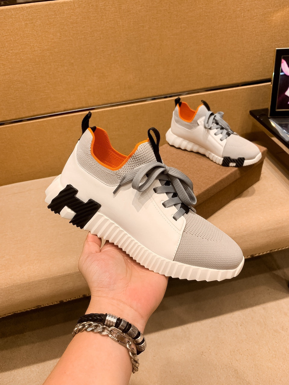 HM Men's Depart Slip-on Sneaker White Grey Knit Cowhide 263685