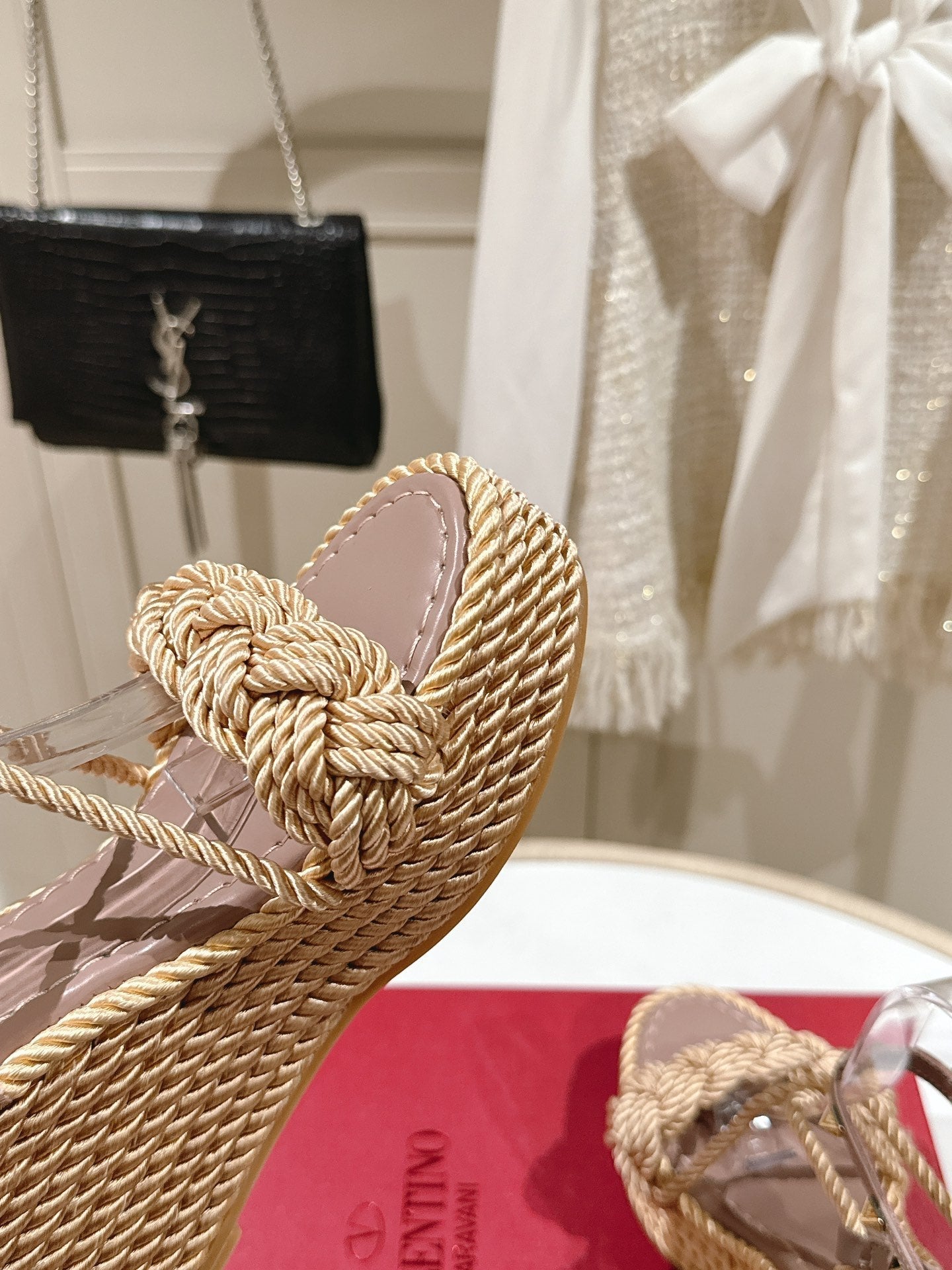 Garavani Rockstud Wedge Sandals 100mm In Beige Mix Rosy Brown Calfskin And Nylon Rope 829396