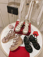 Rockstud Ankle Strap Wedge Sandal Calfskin Black 10cm