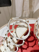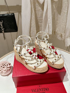 Rockstud Ankle Strap Wedge Sandal In White Calfskin Leather And Beige Raffia 100mm 829388