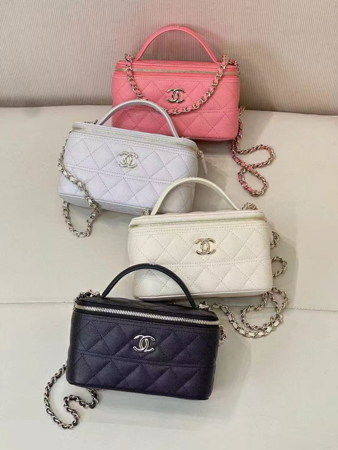 CC 25C Vanity Top Handle 17cm White Grained Calfskin Light Silver Hardware