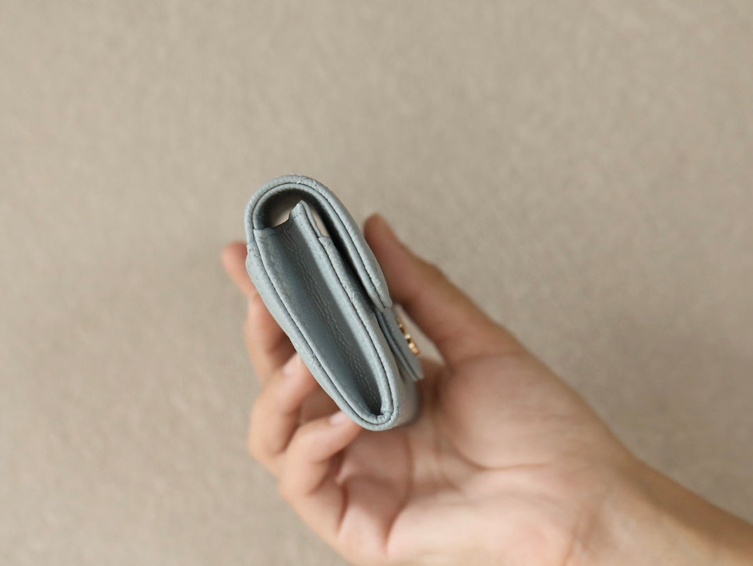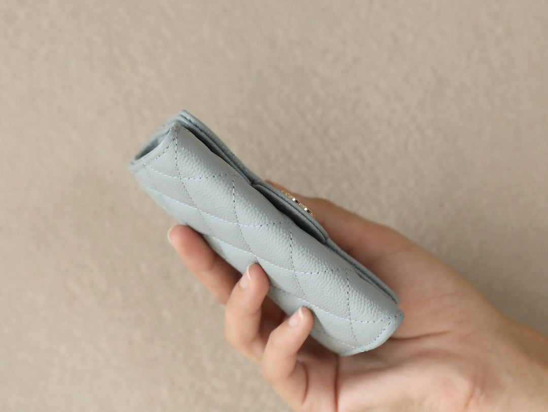 CC FLAP CARD HOLDER 11.3 LIGHT BLUE GRAINED CALFSKIN GOLD ICON