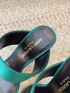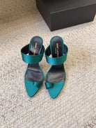 MARTHA POINTED OPEN-TOE HIGH MULES IN TEAL GREEN SILK