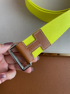 4.0CM YELLOW TEXTILE BROWN LEATHER H BELT