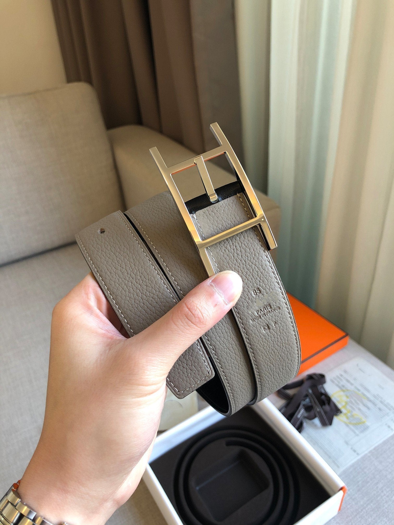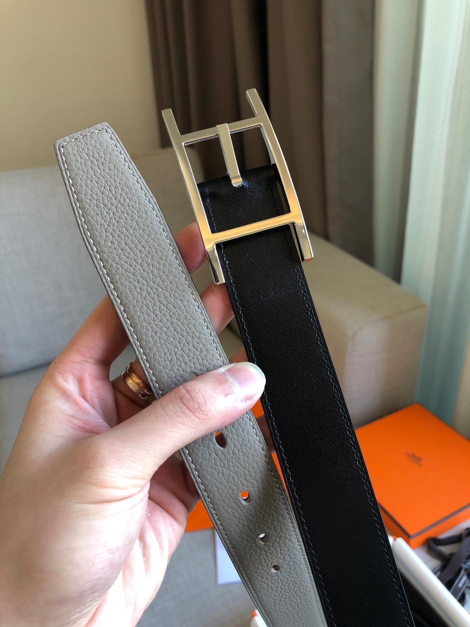 H BELT SILVER BUCKLE GREY BLACK LEATHER REVERSIBLE 3.2CM