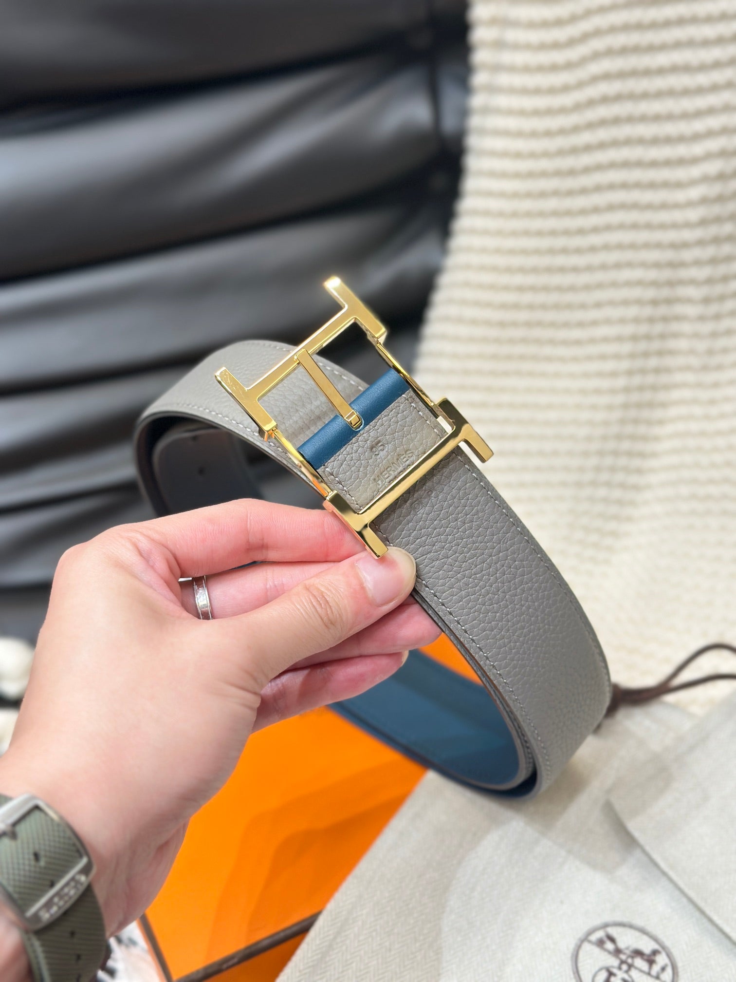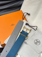 HM HADRIEN 38MM REVERSIBLE BELT GREY AND BLUE LEATHER GOLD BUCKLE