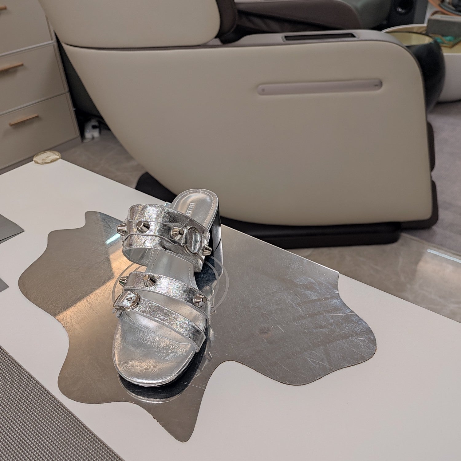 STRAPPY MEDIUM HEELED SANDALS IN SILVER STUDDED WAX-OIL SHEEPSKIN