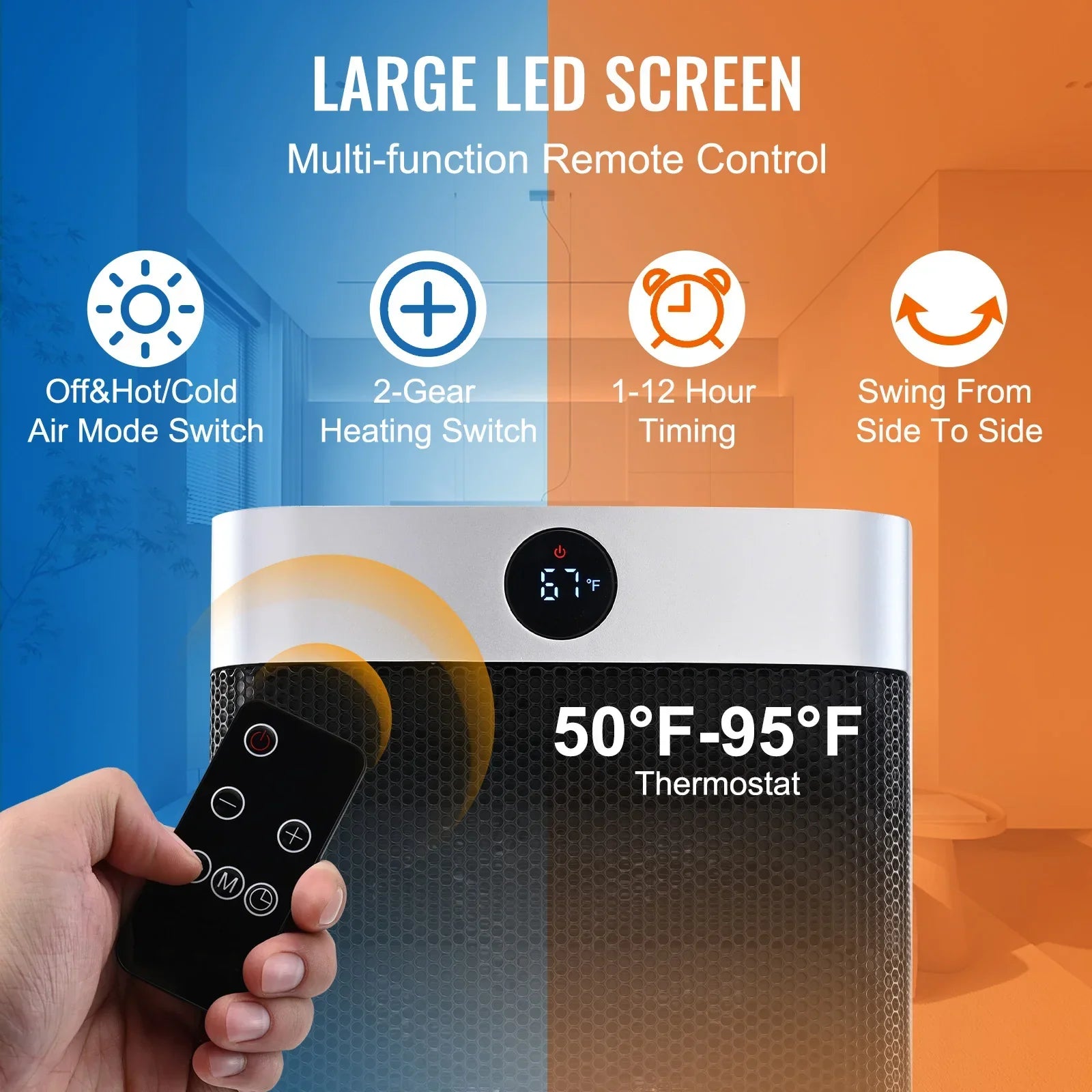 **Smart Controls:** Featuring a remote control, LED display, and a range of functions like oscillation, timer, and thermostat control, it offers complete convenience without leaving your seat.