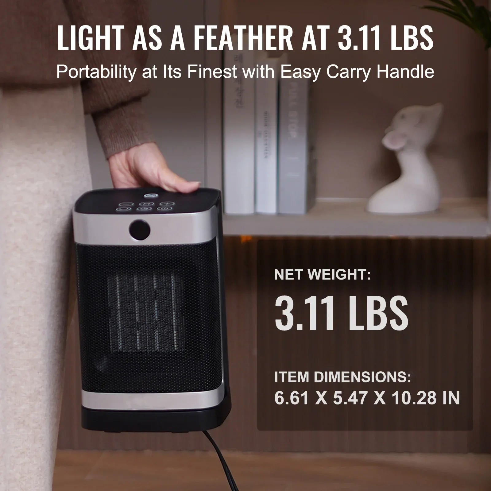 **Lightweight and Portable:** Weighing only 3.11lbs, this heater comes with a comfortable handle for effortless portability, making it perfect for any room in your home or office.